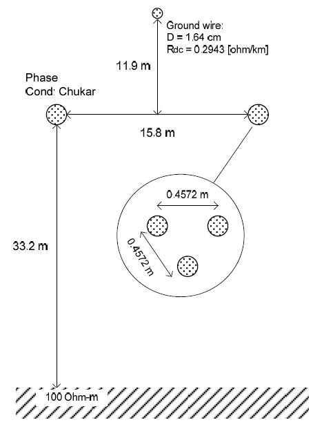 The overhead transmission line (OHTL) considered has a bundle of three ACSR conductors per pole (Chukar conductor) located at a height of 33.2 m at the tower and 14.1 m at midspan. The ground resistivity considered in both cases (i.e., cable and OHTL) was equal to 100 Ω–m. Likewise, a fault resistance equal to 0.01 Ω was considered in all the simulations.