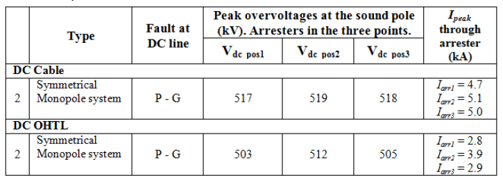 In Table 3, the reduction of the overvoltage at point Vdc_pos2 (552 kV/320 kV=1.75 pu cable; and 532 kV/320 kV =1.66 pu OHTL) for the symmetrical monopole system, is presented. However, as expected, the voltages close to Terminals 1 and 2 (with no arresters) are still high, above 1.95 pu at both line ends. Therefore, it will be necessary to install surge arresters in more than one point.