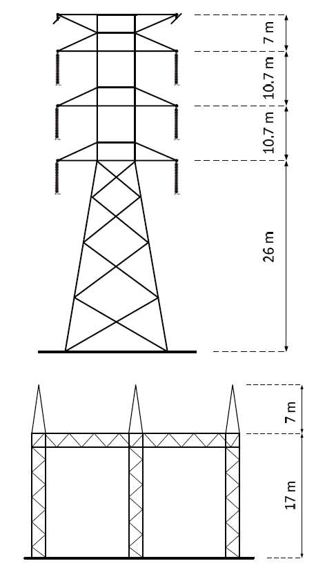 Two parallel lines with conductors per bundle were introduced, as presented in Figure 1. During the lightning strike an overvoltage wave is generated, which propagates and deflects at any point of discontinuity. For this reason it is important to model 5 separate spans of overhead line (400 m each) counting from the portal tower (gantry). A propagating surge wave can be also deflected from the tower base, thus the tower footing resistance (TFR) was implemented as a constant value of resistance equal to 20 Ω. The tower structure (Fig.1) was represented by means of a lossless distributed parameter line, which consists of a surge impedance equal to 172 Ω, a wave propagation speed of 290 m/μs and an associated height. The portal tower (Fig. 1) surge impedance value was equal to 70 Ω [1,4-5].