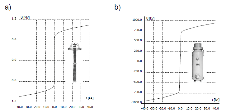 For the overvoltage mitigation purposes both air and gas insulated surge arresters are installed in a substation. In the model they are represented by nonlinear U-I characteristics at 8/20 μs current surge, as presented in Figure 3. Lead lengths and phase-to-ground capacitances have been added, 1 μH/m and 25 pF respectively.