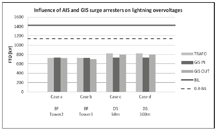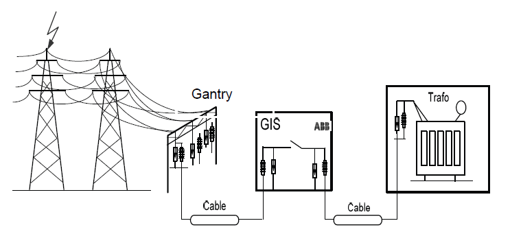 In insulation coordination practice an assumption is made that in all cases an air insulated surge arrester (AIS) is obligatory, and is installed at the gantry of the substation. A GIS surge arrester, installed at the transformer terminal, is also required.