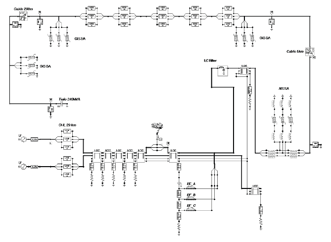 The studied 400 kV network consists of two parallel incoming transmission lines, a GIS substation and HV cables that interconnect the GIS substation with overhead lines (5 km) and the GIS substation with power transformer (0.2 km). An air insulated surge arrester is installed at the portal tower, whereas gas insulated surge arresters are connected at the GIS substation and HV terminals of 310 MVA transformer (Fig.4). A new solution has also been introduced. It was proposed to install a passive overvoltage mitigating device at the portal tower (Fig.4), comprising a high voltage LC low-pass filter [6].
